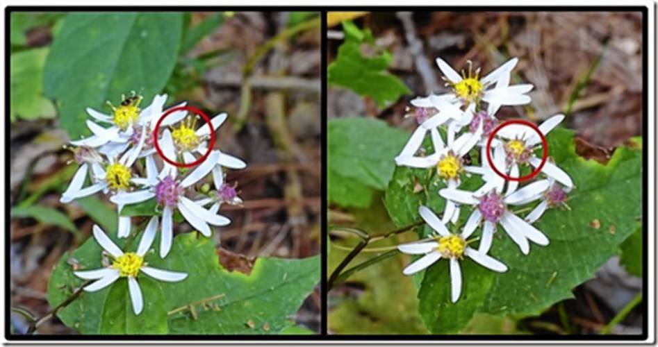 These photographs were taken one day apart. On the top image, the outer disk florets of the top and bottom flower heads have started to change from yellow to magenta, while the disk of the upper right flower head (circled) has gone from mostly yellow to mostly magenta. DAVID SPECTOR