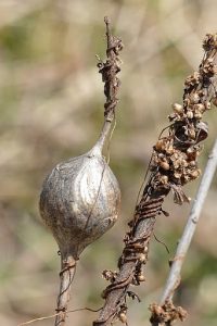 During the winter, you can find Goldenrod by looking for the characteristic galls of the native goldenrod gall fly. The goldenrod gall fly lays its eggs on the buds of goldenrod flowers during the late May or June and their larvae are able to chemically convince the goldenrod to form a hard ball around the larvae that serves as food and protection through the winter. During the spring the larvae emerge as flies.