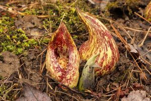 Skunk Cabbage (Col de los Pantanos)es una flor pertenece (una planta que vive más de dos años) y ama el bosque pantanoso a lo largo del sendero Harkness. Florece entre Febrero y Abril y se puede oler antes de verlo. El olor es similar a carne podrida. Su color es es café, púrpura y verde con hojas grandes como col alrededor de las flores. Su nombre viene de su olor y color.