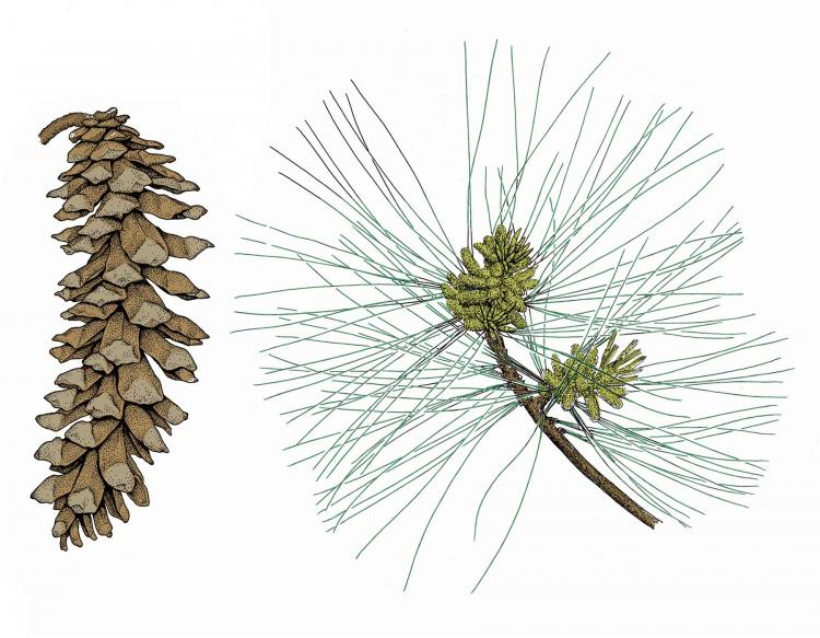 White pine is a tall straight coniferous tree with dark scaly bark. White pines’ best identifier is their bundle of 5 light greenish blue needles that reach 2 to 6 inches long and their long brown pinecones. See our Taste section for a tasty White Pine tea recipe!