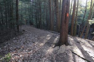 If you stopped for a snack along the trail you wouldn’t be the only one! Woodpeckers seem to have several favorite trees on the trail. Woodpeckers are bark foragers that drill holes into tree trunks to feed on insects including insect larvae, ants who live in the bark. They prefer old or dying trees that are easy to drill into although they will drill into any tree with insects living under the bark. There still isn’t a great understanding of how woodpeckers know there are insects under the bark! The holes of the Pileated Woodpecker are rectangular and can be so large that other animals including owls, swifts, or pine martens use them for shelter. See if you can spot these two trees along the trail. Look for large holes in the trunk and piles of light colored wood chips around the roots. Woodpeckers are messy eaters and leave a trail of their pecking that is easy to spot and fun to find.