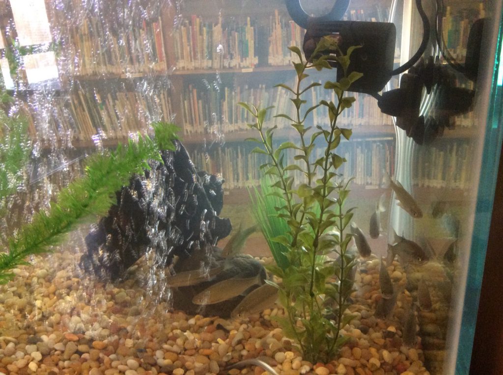 Common Shiners schooling at one end of the Hitchcock Center aquarium during the day.