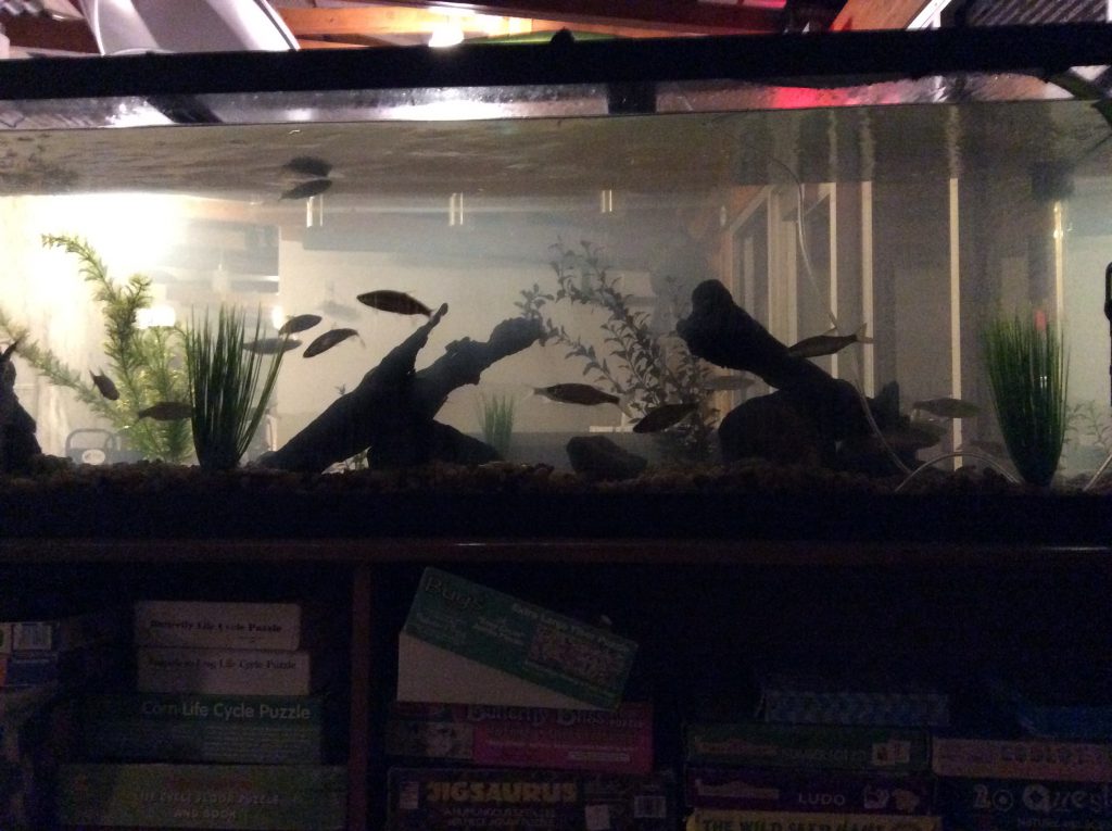 One thing I’ve noticed so far is a distinct difference in daytime and nighttime behavior in the shiners. During the day they school, congregating in the lower half of one end or the other of the tank. Once the overhead lighting goes off they stop schooling and swim independently throughout the entire tank, including the middle and upper portions.