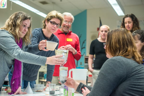 After viewing a clip from the Apollo 13 film, mixed grade-level teacher teams completed a time-limited mission through one of three engineering and design activities: Touch Down on Mars Challenge, Mars Thermos Challenge, and Clean Water in Space Challenge. Following the challenge, teachers debriefed their group’s process and learned from their shared successes and failures.