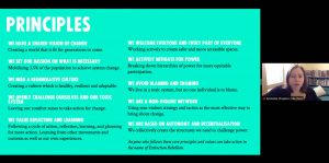 For more action-oriented students, Emmilee Dropkin shared the activism and work of Extinction Rebellion Western Mass, where she serves as a coordinator. Emilee helped the students understand the demands and principles of their activism toward a regenerative culture. Demands include: