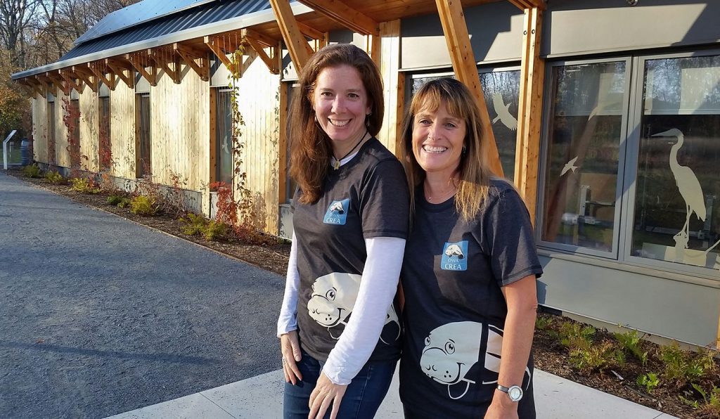 Colleen Kelley (R) and Jessica Schultz (L) pose at the Hitchcock Center wearing shirts brought back from the Centro Rescate Amazonico, in Iquitos, Peru, where one of our spring fellows works and where Jessica recently visited.