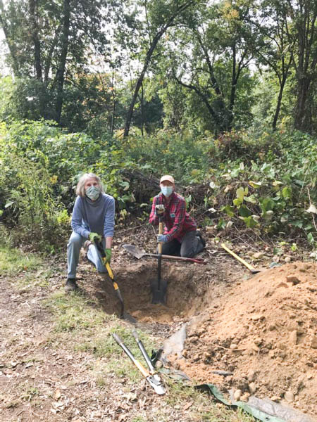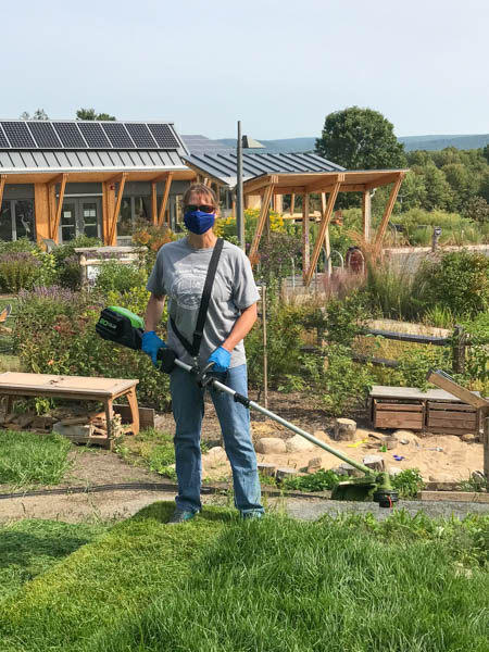 One hot, late July morning, it was just Priscilla White, two students, and me edging some beds, gradually working our way toward the large, sunken area known as the mud kitchen. During rainy periods it holds water, creating a small pool that drains slowly to leave lots of mud for children’s creative play. For health safety, the outdoor play areas were not yet open to the public, so the mud kitchen had remained totally weedy on purpose to discourage play there. The waist-high weeds were dense and robust in an area about eight feet square. Working together, we got the mud kitchen weed free in just an hour, in preparation for a teacher workshop on erosion the following week.