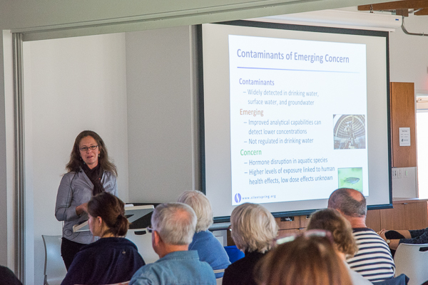 water and found contaminants such as hormones, antimicrobials, pharmaceuticals, highly fluorinated chemicals, pathogens, artificial sweeteners, fragrances, detergents, flame retardants, and preservatives. She spoke about the patterns in her findings as well as her concern about contaminants we haven’t even begun to look at like nanoparticles, metabolites, and chemo-therapeutics, raising the importance of the precautionary principle in guiding policy and regulation.