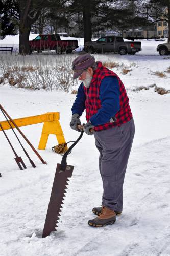 Historian Dennis Picard demonstrates ice harvesting on Nashawannuck Pond during the Easthampton 2018 WinterFest. JOHN CRAFTS