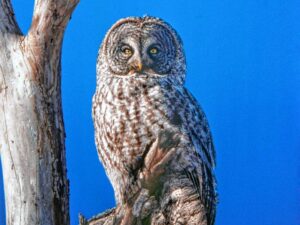 Great grey owls will leave their boreal forest habitat when their population exceeds the supply of prey, which includes lemmings, shrews, weasels, mice, voles and small birds. Photo by Tom Litwin