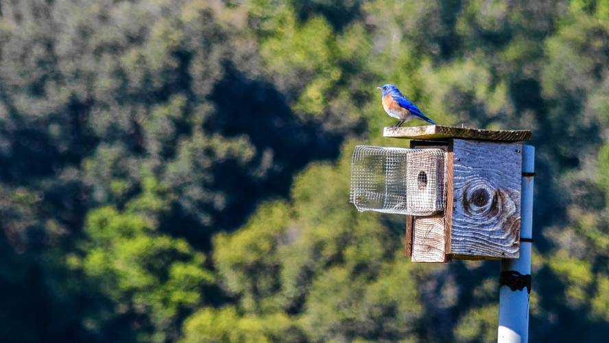 A bluebird stands atop a bluebird nest box in Serpentine Prairie in Redwood Regional Park in Oakland, Calif. The wire mesh hole extension protects against predators. Steven dosRemedios/via Flickr