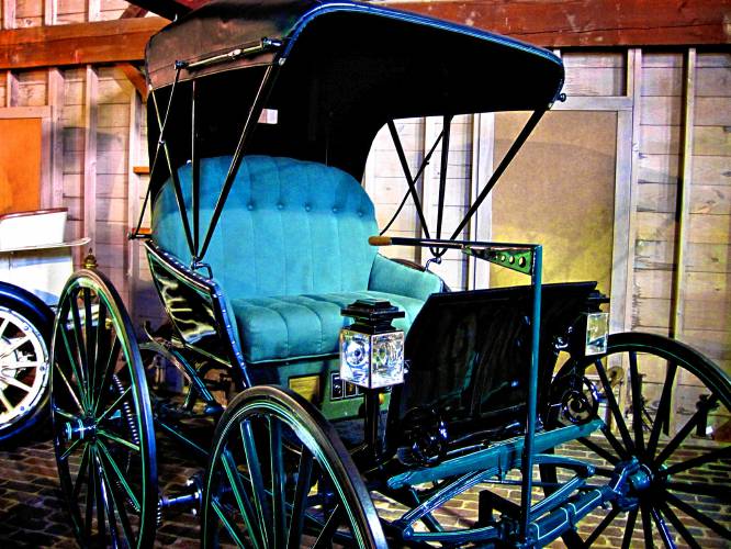 An 1893 Duryea motor wagon built in Springfield, one of the first gasoline-powered automobiles. Gasoline and diesel vehicles are a major source of increased carbon dioxide in the earth’s atmosphere. Via Tsuji /Creative Commons