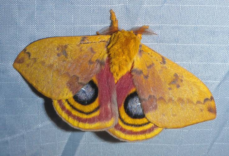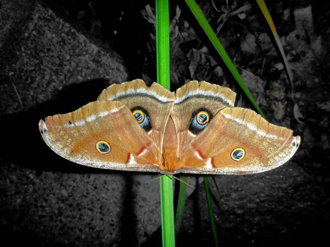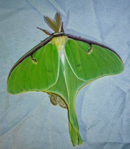 I received one on June 1 from a fellow Hampshire Bird Club member. Her husband was doing tree work on a town common, and photographed a huge moth nearby. I recognized it as a polyphemus moth (Antheraea polyphemus), a member of the family Saturniidae, the giant silkworm moths.