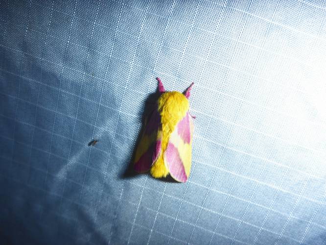 The rosy maple moth is a smaller species distinguished by the adult’s lovely pink and yellow coloration.