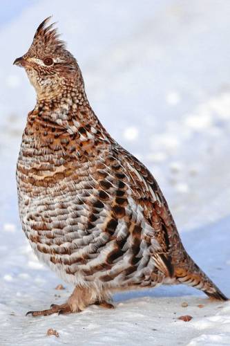 Ruffed grouse, for example, are active in our forests all winter and spend most of their time on the ground. They seldom fly more than a couple hundred yards. They don’t migrate, but spend their entire lives on a territory of a few acres.