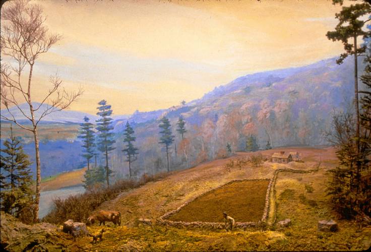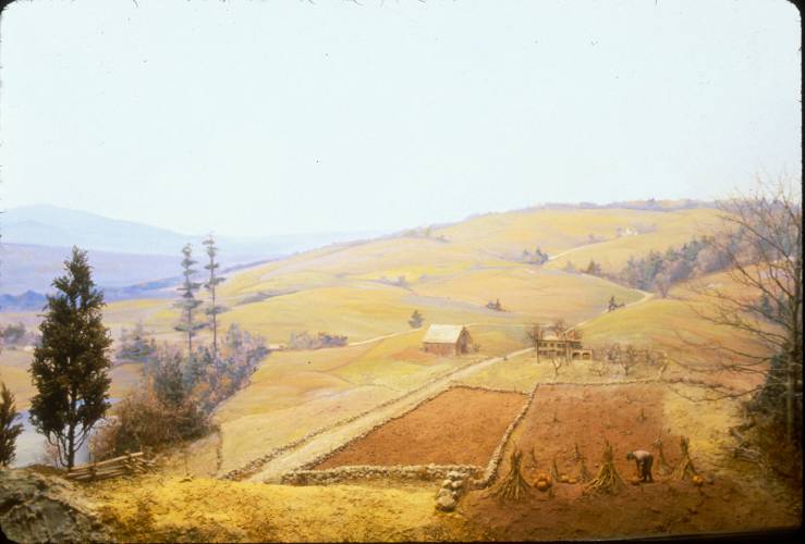 An early subsistence farm in New England (1740-1780), as envisioned in a diorama at Harvard Forest’s Fisher Museum in Petersham. Photo courtesy of Harvard Forest