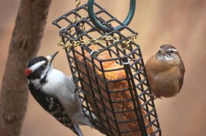Birds often try to guard their food supply and chase others away, but occasionally manage to coexist and share peacefully. Downy woodpeckers and Carolina wrens are both common customers at suet feeders; wrens also love mealworms. Joshua Rose