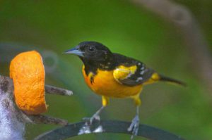 Baltimore orioles, one of the most brilliantly colored of our feeder visitors, are particularly fond of orange halves, but will also bathe and drink at bird baths and sometimes visit sugar water feeders. Joshua Rose