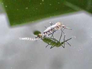 The Asian rock pool mosquito has a great deal in common with the Asian tiger mosquito. Both are nonnative in this country, and both are container breeders, prefer the blood of mammals, and are important vectors of West Nile Virus. This one emerged from its aquatic pupal stage in a greenhouse in Amherst. FOR THE GAZETTE/JOSHUA ROSE