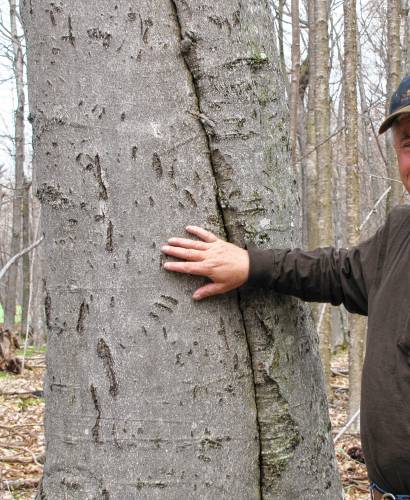 Beeches are relatively common in our area, part of the northern hardwoods group that also includes sugar maple, yellow birch and white ash. And beech trees seem to be increasing in number, especially in Maine, New Hampshire and Vermont, perhaps due to higher temperatures and rainfall brought on by climate change. On many of the larger beeches in our region, you can find a series of four parallel thin slices, each about 3 to 5 inches long, reaching diagonally up into the crown — a bear has climbed this tree! Are the scratches fresh? Perhaps you should carefully and quietly look upwards? More often one finds a genealogy of marks, some more healed than others, chronicling years of mother bears and cubs climbing to reach nutritious, fatty beech nuts on higher branches. Larger bears will reach out and pull the branches in towards the crotch where they perch, creating what looks like a nest but is in fact just a safe and important snack bar.