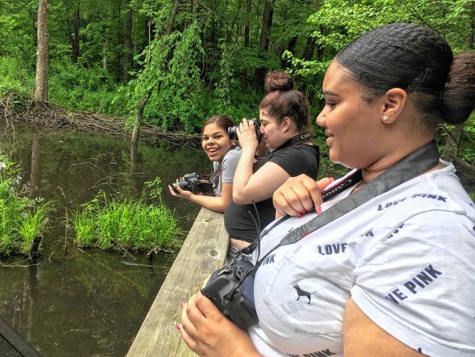 Students from Marjory Zaik’s Care Center class from Holyoke — Yariely, left, Serenity and Genesis — learned about nature photography at the Silvio Conte National Wildlife Refuge in Hadley on a visit last June. The program was coordinated by Kestrel Land Trust with photographer Michael Zide. Kestrtel Land Trust