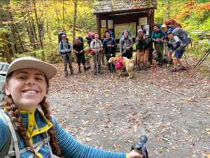The Venture Out Project’s Ana Seiler smiles for a selfie with nine queer backpackers and one dog all dressed for a backcountry trip standing behind her in the autumn leaves. PHOTO COURTESY THE VENTURE OUT PROJECT