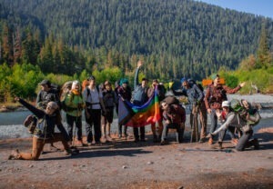 Twelve queer people wearing outdoor gear and backpacks pose together in the sun, holding a large progress pride flag in the center. They’re lined up in front of a rocky blue river beneath a conifer forest. PHOTO COURTESY THE VENTURE OUT PROJECT