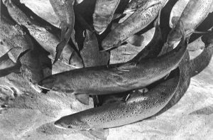 With their dorsal fins tagged for later identification, salmon swim in a pool at the Berkshire National Fish Hatchery at Monterey, Mass., July 22, 1981. Sufficiently developed fish are placed in the Connecticut River where the will hopefully return to spawn after their migration to the Atlantic Ocean. (AP Photo)