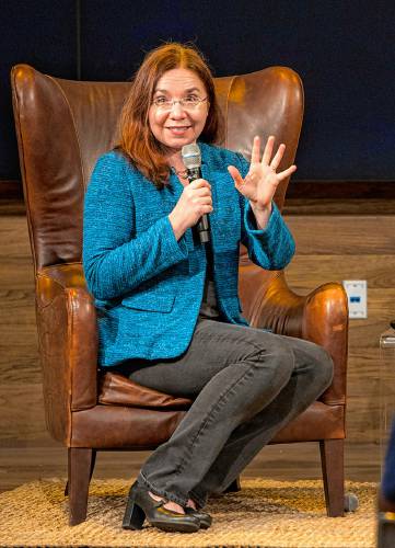 Climate scientist Katharine Hayhoe speaking in 2018 at the LBJ Presidential Library in Austin, Texas. Jay Godwin/via Wikimedia Commons