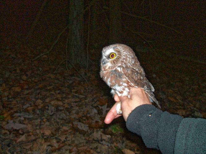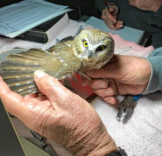 Conservationists are learning more about saw-whet owls through a banding and data collection process conducted by certified banders. This was one of 15 owls banded in November at Kestrel Land Trust’s Amherst headquarters on the Mount Holyoke Range. KESTREL LAND TRUST