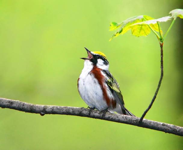 A male chestnut-sided warbler sings different songs at dawn and in daylight. John Van de Graaff