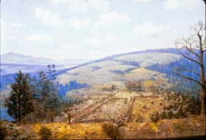 Farm abandonment in New England around 1870, as envisioned in a diorama at Harvard Forest’s Fisher Museum in Petersham. COURTESY OF HARVARD FOREST
