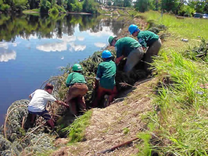 A 2002 restoration project using overgrown Christmas trees to help restore a severely eroded riverbank along the Connecticut River in Vermont. Aquatic plants were later established on the stabilized site.” The U.S. Environmental Protection Agency