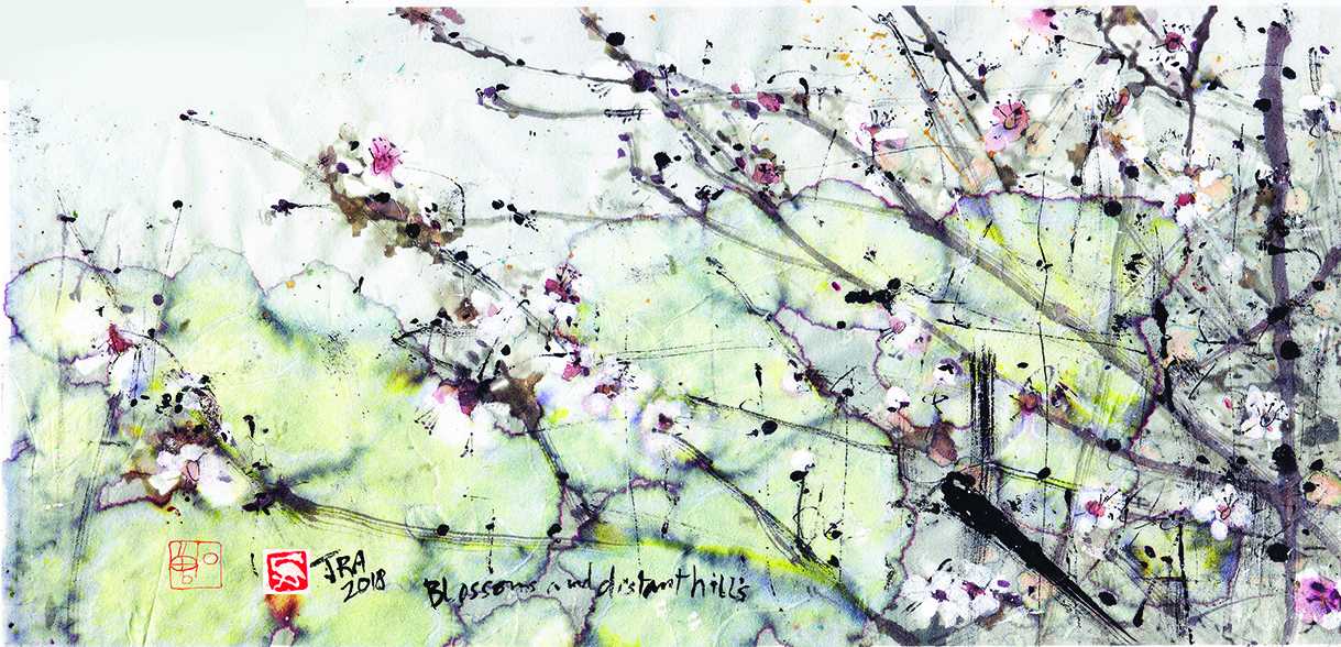 Jay Alexander’s paintings present a contemporary reinterpretation of several dominant themes in classical Chinese painting: the plum, orchid, flowering plants, birds, and landscapes. He brings his experience and technique to these ancient venerable genres, depicting the above subjects in the moods, seasons and light of his environment. These subjects are expressed through his deep attachment to the natural world filtered through a vast body of theory with metaphysical underpinnings—that art is a spontaneous expression, immediate and irrevocable as life itself, where the essential truth of a painted object is the operation of the spirit (Chi) in life movement (Zheng tung).