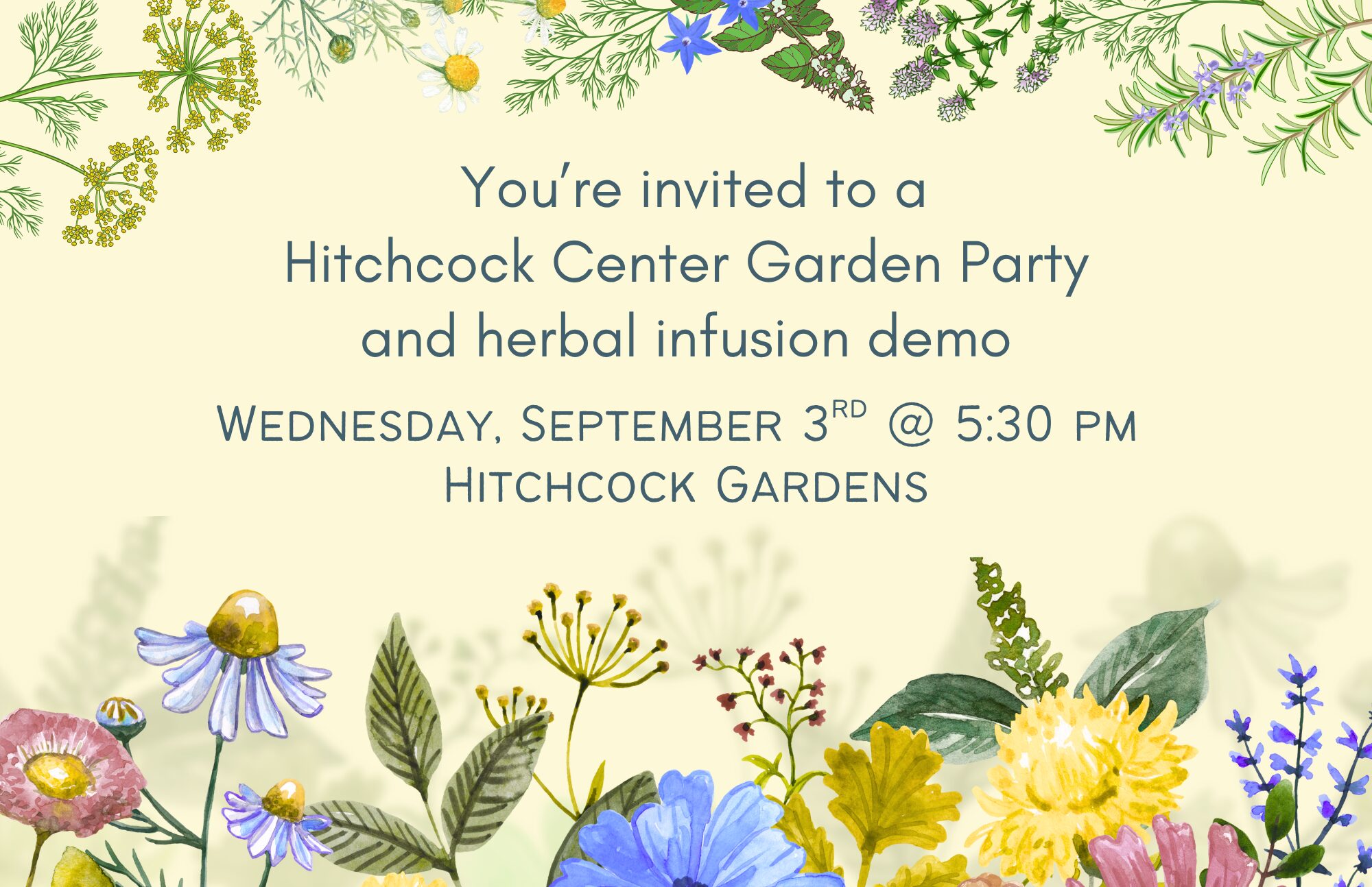 Garden Party & Herbal Infusion Demo Wednesday, September 3rd 5:30 pm in the Hitchcock gardens Join us for a casual gathering in the Hitchcock Center’s beautiful gardens and enjoy a demonstration on how to make a variety of infusions with seasonal herbs and flowers and learn more about the work of the Hitchcock Center with […] |