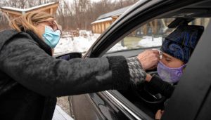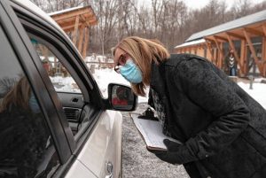 Julie Johnson, the executive director of the Hitchcock Center For The Environment in Amherst, checks parents and toddlers in for the Nature Discovery Preschool program Friday, February 5, 2021. STAFF PHOTO/CAROL LOLLIS