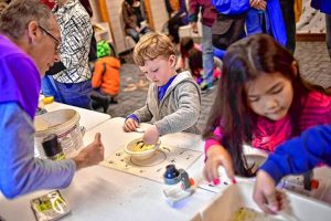 Jeff Mazur, left, with the Hitchcock Center shows Konrad Henry, 3, how to pick up a crayfish during the Grand Opening of the new Hitchcock Center Saturday, Oct. 1, 2016 at 845 West Street in Amherst. STAFF FILE PHOTO