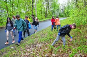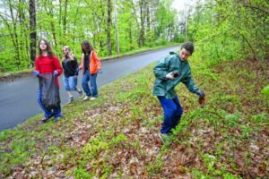 Students from Four Rivers Charter Public School pick up trash along Eunice Williams Drive in Greenfield near the covered bridge on Wednesday. STAFF PHOTO/PAUL FRANZ
