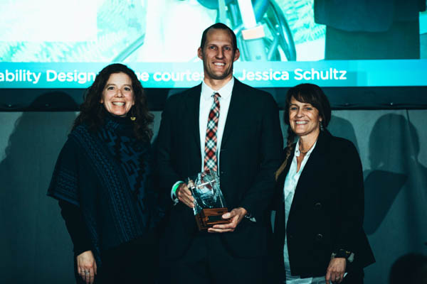 L to R: Jessica Schultz, Communications and Living Building Coordinator Hitchcock Center, Sam Batchelor, Partner, designLAB Architects, Colleen Kelly Education Director, Hitchcock Center receive the BSA Honor Award for Sustainable Design. Photo: Kit Castagne
