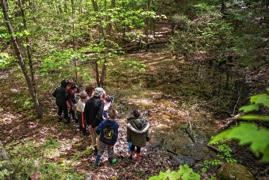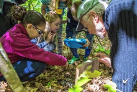 Dead leaves and plants littered the dirt and the group scrambled over a few logs and rocks making their way through the wooded area on city-owned conservation land. After a few minutes, the group, led by teacher Renee Bachman and Hitchcock Center environmental educator Ted Watt, reached a clearing where the students were on a mission: take count of how many red-backed salamanders they see.