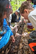Though the project is about red-backed salamanders, Watt took opportunities to educate the students more generally about their natural surroundings. Spotting some leaves on the ground, he asked why they were there. “These leaves didn’t fall by themselves,” he said, noting that only happens in the fall. He picked up a leaf and showed two bite marks on it to the students who circled around him. Squirrels like to eat the seeds on the tree and drop the branches, he explained.
