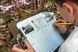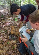 In the forest clearing, small square wooden boards were previously placed on the ground. Several small groups of students started to overturn boards, searching for red-backed salamanders. They record information on a clipboard, like how many they see and conditions like the air temperature and wind. When they find a creature, a student documents it by taking a photo with an iPad.