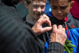 Leeds Elementary School third graders Jai Schaefer, left, and Jahir Sanchez De La Cruz listen to naturalist and environmental educator Ted Watt of the Hitchcock Center for the Environment explain how he determined what kind of animal likely bit through a leaf stem. STAFF PHOTO/KEVIN GUTTING