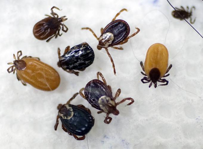 In this May 15, 2017 file photo, ticks are displayed that were collected by South Street Veterinary Services in Pittsfield, Mass. Tick numbers are on the rise across New England this spring, raising the prospect of an increase in Lyme and other diseases. Ben Garver/The Berkshire Eagle via AP